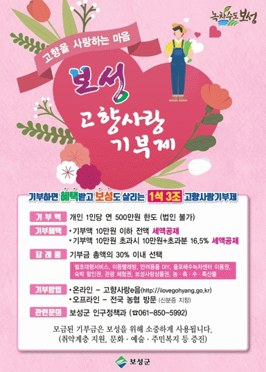 보성군 고향사랑기부제는 지난 12일 기준 기부자는 1,029명이며, 전체 기부자 중 100만 원 이상 고액 기부자는 17명, 기부 한도액인 500만 원 기부자는 8명에 달한다.