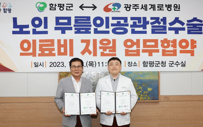 전남 함평군은 13일 “어르신들의 무릎인공관절 수술 진료비 지원을 위해 광주 세계로 병원과 업무 협약을 체결했다”고 밝혔다.