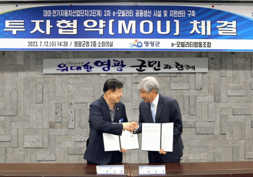 협약은 7월 12일 영광군청에서 영광군수와 이모빌리티협동조합 최병훈 이사장이 참석한 가운데 체결됐다. 이모빌리티협동조합은 이모빌리티 제품의 부품 공동생산을 위해 11개 e-모빌리티 기업이 모여 결성했으며, 자동차 부품 중견기업인 네오텍 최병훈 회장이 이사장을 맡고 있다. 이번 협약으로 2차 e-모빌리티 공용생산시설 및 지원센터를 대마 전기자동차산업단지 2단계에 투자키로 했고 이로 인한 고용창출은 약 100여 명이 될 것으로 예상되며 해외수출주도형 대응생산시설, 연구시설 등을 조성할 계획이다.