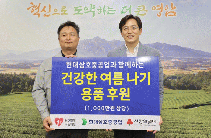 현대삼호중공업 박한규 수석부장은 “우리 지역 취약계층의 건강한 여름나기를 위해 임직원들이 자발적으로 기부하여 준비했으며, 앞으로도 지역사회에 대한 공헌활동을 펼쳐 나가겠다.”는 뜻을 밝혔다.