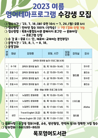 수강생은 목포시통합도서관 홈페이지를 통해 오는 18일부터 24일까지 선착순으로 모집하며, 접수 방법 등 기타 자세한 내용은 홈페이지(열린마당→공지사항)를 참고하면 된다.