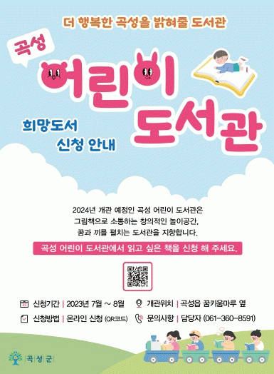군 관계자는“곡성 어린이 도서관은 전 연령층을 아우르는 창의적인 복합문화공간을 지향한다. 이번 희망 도서 접수를 통해 모든 군민에게 사랑받는 도서관으로 성장할 수 있기를 바란다.”고 말했다.