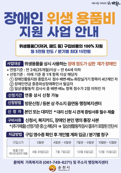 순천시 관계자는 “전국 최초로 장애유형, 소득과 무관하게 장애인 위생용품 구입비를 지원하고 있으며 장애인 가정의 경제적 안정과 인권존중을 위해 앞으로도 지속적으로 노력하겠다”라고 밝혔다.