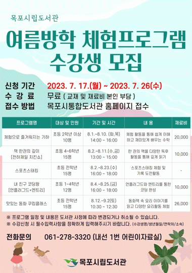 참가 신청은 목포시통합도서관 홈페이지에서 가능하며, 자세한 사항은 홈페이지 또는 전화로 확인 할 수 있다.