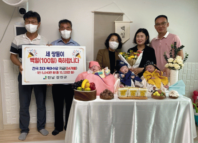 강진원 군수는 “2017년 세쌍둥이 탄생 이후 6년 만에 지난 4월 세쌍둥이 탄생이 강진군 출산장려 분위기 확산에 큰 도움을 주었다”며 “적극적인 육아 출산정책이 지방소멸 위기속 인구증가 효과를 나타낼 것으로 기대한다”고 말했다.