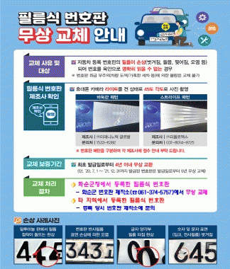 화순군 관계자는 “필름식 번호판 무상 교체가 시행되고 있으나 모르고 있는 차주들이 많은 상황”이라며, “필름식 번호판이 손상된 채로 차량 운행 시 자동차 관리법에 따른 과태료 등 불이익을 받을 수 있어 조기에 교체하길 바란다”라고 말했다.