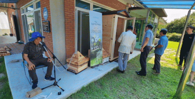 설종수 대표의 꿀벌 공기 호흡에 이용하는 장치와 방법 등 설명에 이어 에어컬럭터(공기흡입기계), 에어부스(이동식 통나무집) 공기캔 등 체험 행사로 이어졌다.