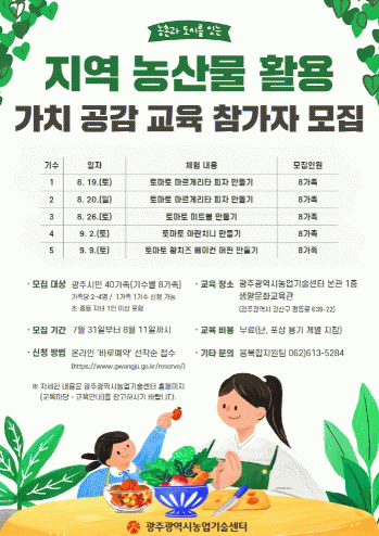 자세한 내용은 광주시농업기술센터 홈페이지를 참조하거나 융복합지원팀으로 문의하면 된다.
