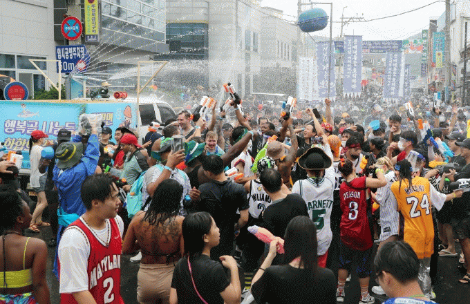 관광객과 지역민들은 사방에서 쏟아지는 물세례 때문에 처음엔 주춤하다가도 금방 물에 젖어 신나는 물싸움을 벌이게 된다.