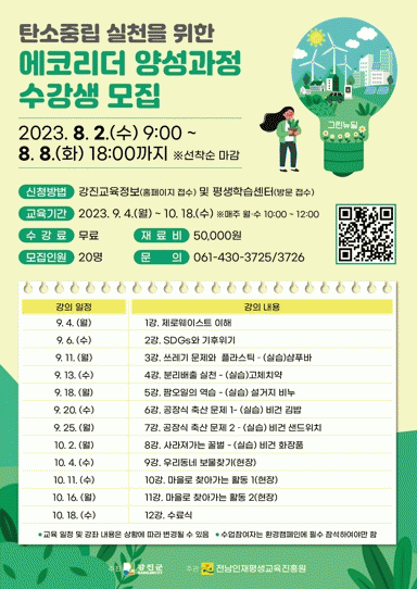 에코리더 양성과정은 기후 위기 시대에 일상 생활에서 실천 가능하고 지속 가능한 미래를 위한 생태환경교육이다. 환경, 기후, 생태에 관해 관심 있는 군민 누구나 신청 가능하며, 개인의 실천에서 그치지 않고 나아가 지역에 전파하고 활동할 수 있는 에코리더로 양성하기 위해 마련됐다.