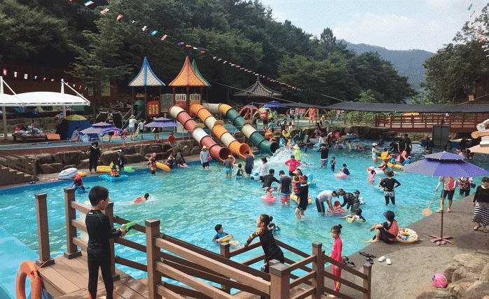 이용객 연령대를 고려한 3개의 풀장과 텐트·돗자리를 펼 수 있는 평상 20개소, 물미끄럼틀 1식, 남·여 샤워장, 화장실, 총 125면의 주차시설 등을 갖췄다.