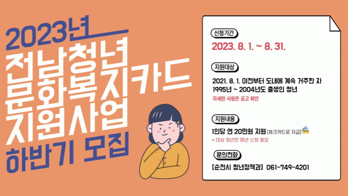 자세한 공모내용과 신청자격은 순천시청 누리집 고시공고에서 확인할 수 있으며, 문의는 청년정책과 청년지원팀으로 하면 된다.