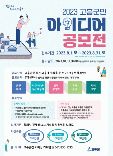 고흥군 관계자는 “우수 아이디어를 정책에 반영하여 군민과 함께하는 참여 행정을 실현할 수 있도록 정책 아이디어 공모에 많은 관심과 참여를 부탁한다.”고 말했다.