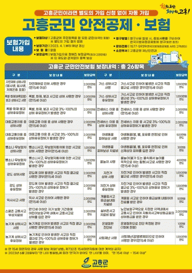 ‘군민안전보험’은 사고를 당했을 경우 고흥군과 계약 체결된 보험사를 통해 보험금을 지급받을 수 있는 제도로, 수혜 대상은 모든 군민이며 고흥군민이라면 누구나 별도의 절차 없이 자동 가입되고, 사고 발생 시 개인보험과 중복 보상도 가능하다.
