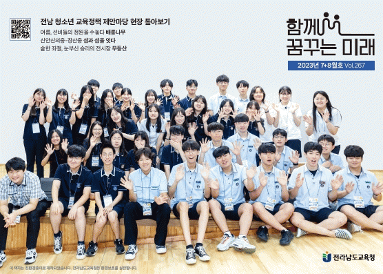 이번 호 특집은 지난 7월 13일 열린 ‘2023. 전남 청소년 교육정책 제안마당 톺아보기’로, 청소년들이 직접 고안하고 제안하는 교육정책들을 담고 있다. 청소년 교육정책 제안마당에 1차 선발된 중·고등학생 13팀이 제안한 전남교육이 추구해야 할 정책 방향, 교육행정시스템 개선점들을 소개한다. 학교생활에서 경험한 문제를 교육정책으로 만들고 발표하는 과정에서 청소년들이 느낀 성취감을 엿볼 수 있다.