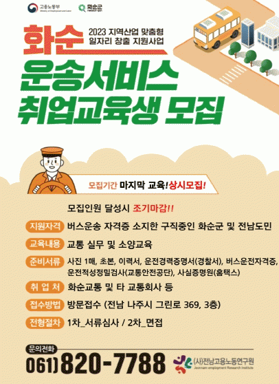 대상은 화순군 또는 전라남도에 주소지를 둔 버스운전자격증 소지자로 모집 기간은 공고일로부터 8월 4일 18시까지이며, 참여 희망자는 제출서류를 준비하여 (사)전남고용노동연구원(전남 나주시 그린로 369, 3층)으로 방문 접수하면 된다.