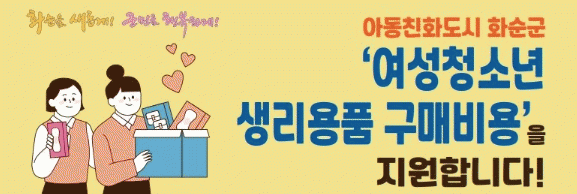 다만, 저소득층에게 지원하는 여성가족부의 보건 위생용품 지원과는 중복으로 지원되지 않으며, 올해 12월 31일까지 화순사랑상품권 가맹업소인 ▲마트 ▲편의점 ▲약국에서 생리용품을 구매하면 된다.