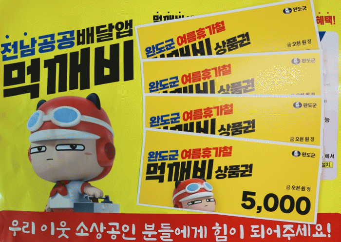 ‘먹깨비’ 할인 쿠폰은 5천원 권 지류 상품권으로 7월 28일과 8월 4일, 8월 10일 오전 11시부터 12시까지 완도읍사무소 내 카페 공간에서 배부한다.