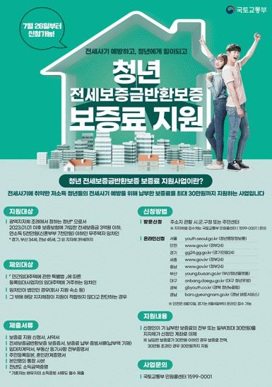 이번 보증료 지원사업은 전세사기에 노출될 위험이 상대적으로 큰 청년과 신혼부부의 전세보증금 반환보증 가입을 유도하기 위한 것으로 청년 임차인이이미 납부한 보증료를 최대 30만 원까지 지원한다.