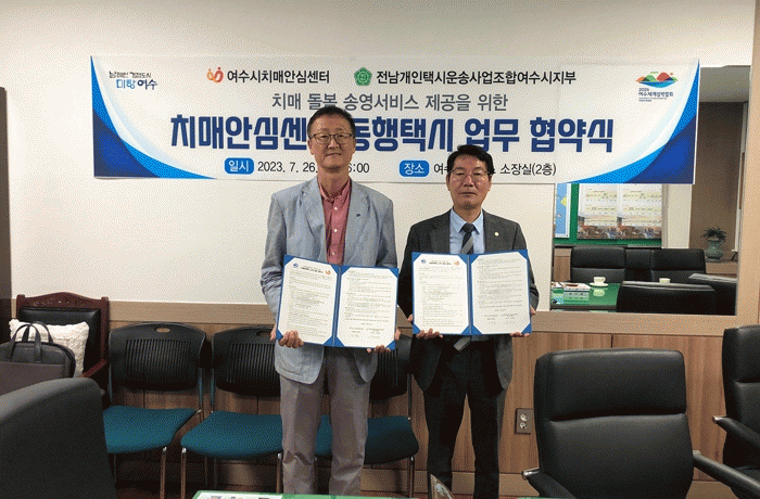 주요 협약내용은 ▲여수시치매안심센터 프로그램 참여 치매환자와 가족에 대한 택시 이용 지원 ▲여수시치매안심센터 프로그램 운영에 맞추어 운행 협력 ▲운행코스와 이용자 수 및 운행방법에 대한 실천 협력 ▲ 그 밖에 양 기관의 이행사항에 대한 협력 등이다.