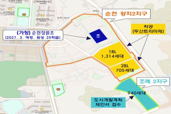 (가칭)순천정원초등학교는 왕지2지구 내 1만 5,004㎡ 부지에 총사업비 562억 원을 들여 초등 25학급, 병설유치원 2학급 규모로 신설되며, 2027년 3월 개교 예정이다.