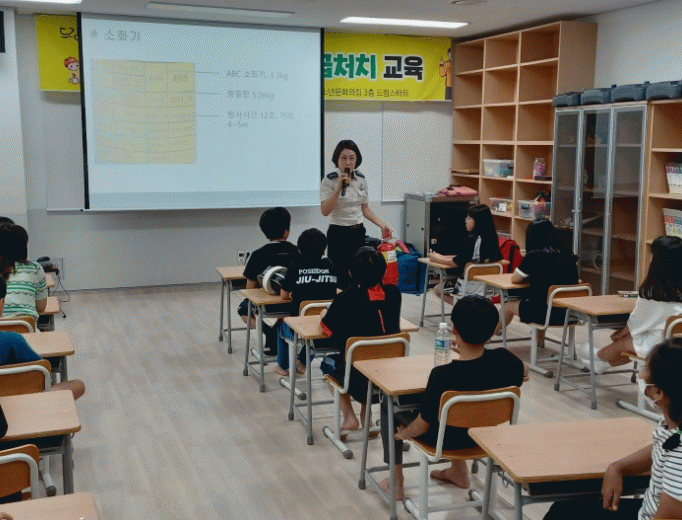 최선영 반장은 음식물 등에 의해 기도가 막히거나 밀폐공간에서 질식 위험이 발생 시, 피해를 최소화할 수 있는 방법에 대해 알려주고, 어린이들이 쉽게 이해하고 접근할 수 있도록 젤리가 기도를 막아 숨쉬기 어려운 상황을 가정해, 하임리히법과 심폐소생술로 위기 상황을 대처하는 역할극으로 수업을 진행했다.