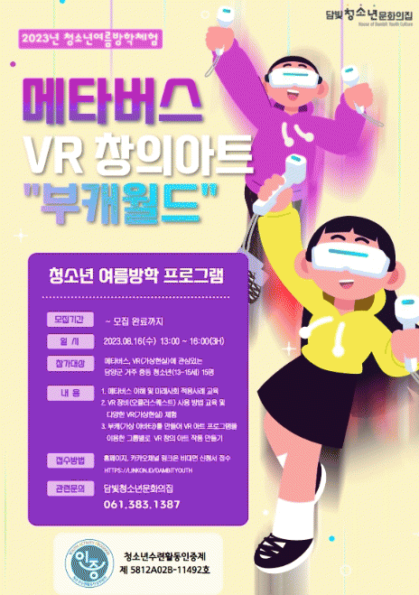 ‘부캐월드’는 여름방학을 맞이해 4차 산업기술인 VR(가상현실)을 이용한 예술작품을 만드는 프로그램으로 오는 8월 9일, 8월 16일 총 2회기로 진행되며 참여 청소년은 담빛청소년문화의집 홈페이지, 카카오채널에서 비대면으로 모집할 예정이다.