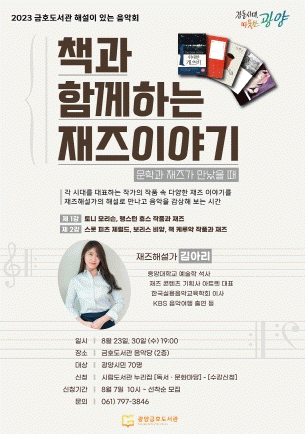 '문학과 재즈가 만났을 때'를 주제로 개최하는 이번 음악회는 김아리 재즈해설가의 강연 2회(23일, 30일)와 강승훈 트리오(피아노, 보컬, 베이스)의 공연 1회(9월 8일)로 구성돼 도서관을 찾은 시민들에게 풍성한 음악과 볼거리를 제공할 것으로 기대된다.