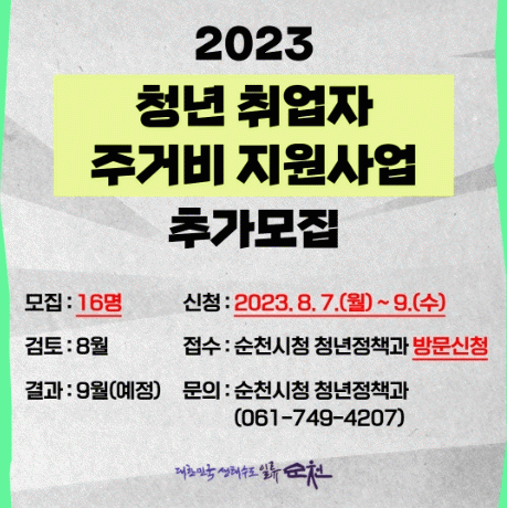 신청은 순천시청 청년정책과로 방문해 접수하면 된다. 기타 사항은 시 누리집에서 확인할 수 있으며 문의는 청년지원팀으로 하면 된다.