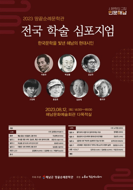 이번 심포지엄은 이성혁, 최진석, 김효은, 남승원, 정재훈, 김남규, 김지녀, 장은영 등 한국 비평계에서 가장 주목받는 젊은 평론가들이 한자리에 모여 한국 한국 문학사에 깊은 족적을 남긴 해남 출신 현대 시인들의 삶과 문학세계를 심도있게 조명하는 자리를 마련한다.