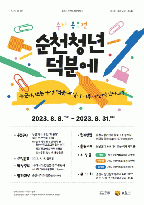 응모 대상은 순천 거주 청년으로, ‘덕분에’ 이루어진 일을 A4용지 1매 내로 자유롭게 작성하면 된다. 보편적으로 모든 청년들이 공감할 수 있는 이야기부터 특별한 개인적 경험에 이르기까지, 시와 수필, 감상문 등 형식에 제한 없이 모든 글을 대상으로 한다.