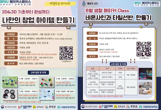 현재 8월 프로그램의 신청자를 모집하고 있으며, 무안군 홈페이지 공지사항을 확인하거나 ‘MNU메이커스페이스’카카오톡채널을 추가하면 공고 중인 프로그램의 내용과 자세한 신청 방법을 확인할 수 있다. 궁금한 사항은 목포대학교 창업혁신센터 MNU메이커스페이스로 문의하면 된다.