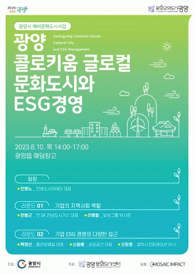 ‘도시 간 콜로키움’은 문화도시 시민협의체인 ‘광양시민원탁’의 공동 학습의 장으로 마련됐으며 ‘지역사회와 기업 ESG경영’을 주제로 진행될 예정이다.
