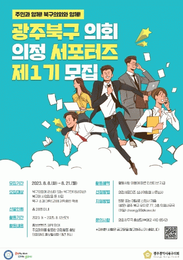 보다 자세한 사항은 광주광역시 북구의회 홈페이지의 모집공고에서 확인할 수 있으며, 자격요건 등의 심사를 거쳐 최종 선정된 서포터즈는 오는 9월 신규 SNS(인스타그램) 개설 후부터 본격적인 활동을 시작하게 된다.