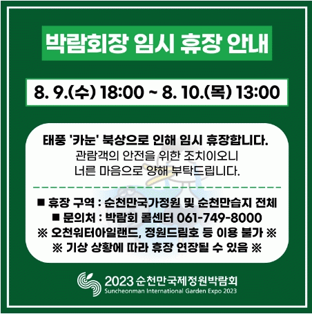 ‘카눈’은 경남 남해안에 상륙해 강풍과 폭우가 예상됨에 따라 조직위는 순천만국가정원과 순천만습지 전체 임시 휴장을 결정하고, 재난안전대책본부를 가동한다.
