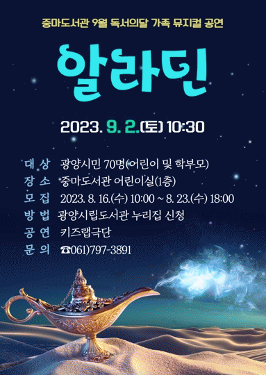 김미라 도서관과장은 “9월 독서의 달을 맞아 온 가족이 함께 즐길 수 있는 공연을 준비했다”며 “뮤지컬 공연이 시민들에게 잊지 못할 가족과의 즐거운 추억이 될 수 있기를 기대한다”고 말했다.