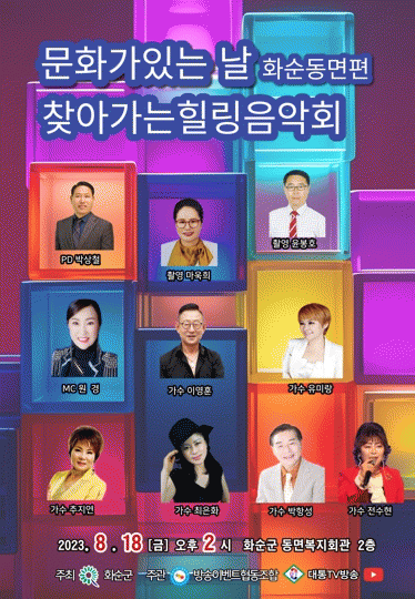힐링 음악회는 지난 5월 화순읍 편을 시작으로, 6월에는 능주면 편, 7월에는 한천면 편이 열렸으며 오는 8월 18일 14시에는 동면 주민건강센터에서, 9월 6일 14시에는 춘양면 복지회관, 같은 달 20일 14시에는 이서면 복지회관에서 각각 개최될 예정이다.