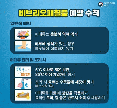 예방을 위해서는 ▲어패류 완전히 익혀먹기 ▲상처 난 피부 바닷물 접촉금지 ▲어패류를 요리한 도마, 칼 등은 소독 후 사용하기 ▲어패류 5℃ 이하 저온 보관 및 85℃ 이상 가열해야 한다.
