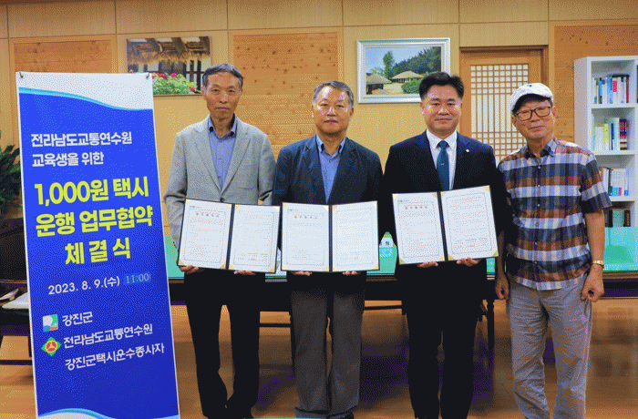 체결식에는 강진군 서순철 부군수, 이병희 교통연수원장, 최성호 대표 등 6여 명이 참석했으며, MOU는 전라남도교통연수원 교육생 등이 단돈 천 원으로 택시를 이용할 수 있도록 상호 간 협력 체계를 구축하는 것을 주 골자로 한다.