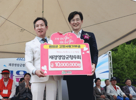 지난 6월 서울 영등포한강공원에서 열린 ‘2023 재경영암군향우회 체육대회’ 기념식에서 재경영암군향우회는 기부를 약속했고, 이날 실천에 옮긴 것.