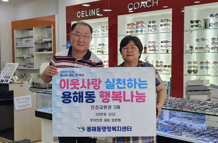 이명옥 용해동장은 “사랑 나눔을 실천해 주신 포미전문안경점(양민화 대표)에 감사드리며, 손길이 필요한 이웃들을 발굴하고 다양한 프로그램을 연계함으로써 복지체감도를 높이도록 노력하겠다 ”고 말했다.