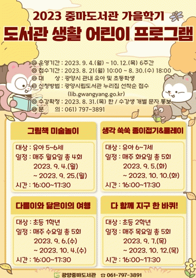 중마도서관 관계자는 “지역 어린이들이 이번 가을학기 프로그램에 참여해 배움의 기쁨을 경험하면서 창의력과 잠재력을 개발하고, 꿈과 희망을 마음껏 펼칠 수 있길 바란다”고 전했다.