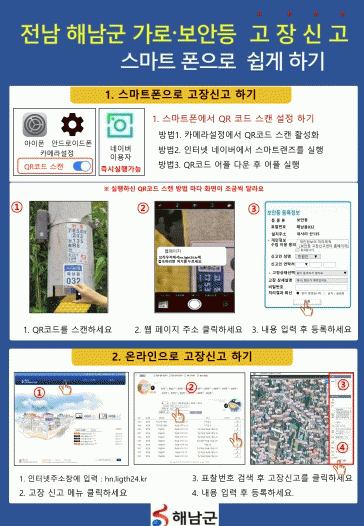 또한 전화신고에 의존하던 민원신고를 QR코드를 통해 온라인 접수까지 가능해 지면서 보다 신고의 편의성도 크게 개선됐다. 이번에 도입된 QR코드 시스템은 별도의 앱을 설치할 필요 없이 민원인이 표찰에 부착된 QR코드를 스캔하면 자동으로 해당 가로·보안등의 고장 신고 화면으로 연결된다. 고장 신고 전송 시 시스템에서 실시간 신고내용을 접수, 보수팀에 전송하게 되어 바로 처리가 가능해졌다.