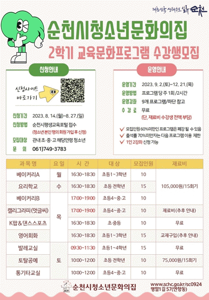 궁금한 사항은 순천시 청소년문화의집으로 문의하면 된다.