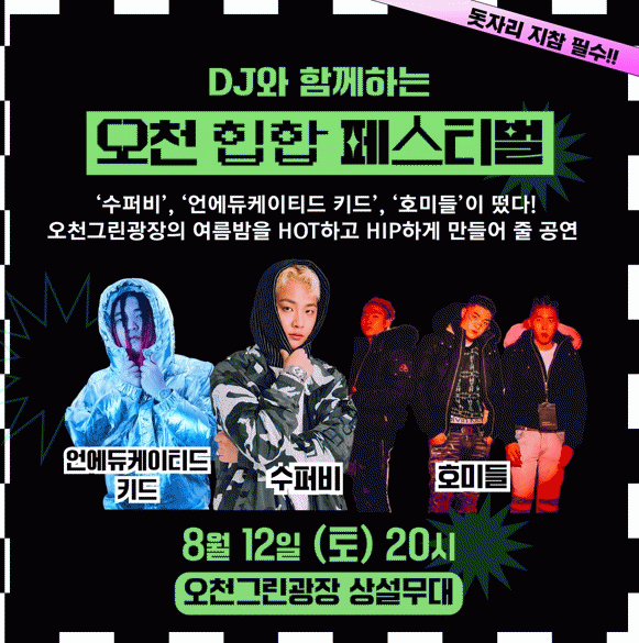 ‘오천 힙합 콘서트’는 오후 8시 오천그린광장에서 개최되며, 힙합씬에서 핫한 레이블인 영앤리치 레코즈의 수장 수퍼비와 소속 가수인 호미들과 언에듀케이티드 키드가 출연한다.