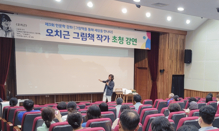 이날 강좌에서 그림책 '오징어와 검복'으로 알려진 오치근 작가는, ‘그림책으로 가꾸는 소통과 삶의 이야기’를 주제로 영암군민과 만났다.