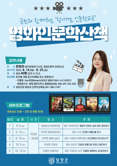 강의는 영화 인문학 전문 강사인 현정아 생각변화연구소장이 맡아 ‘영화 인문학 산책’을 주제로 인문학적 시각에서 영화가 담고 있는 메시지를 강연과 토론을 통해 전달한다.