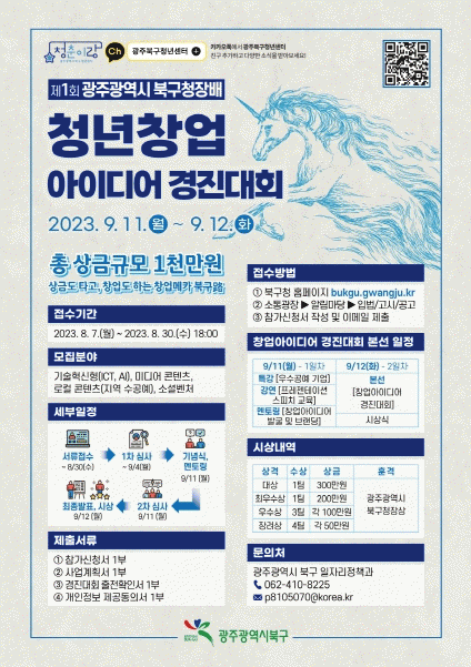 대회 참가분야는 미디어 콘텐츠, 소셜벤처, 로컬 콘텐츠, 기술혁신형 분야이고 광주에 생활권을 둔 15세부터 39세까지의 청년들로 구성된 참가팀(3~5명)들의 신선하고 창의적인 창업 아이디어를 모집할 계획이다.