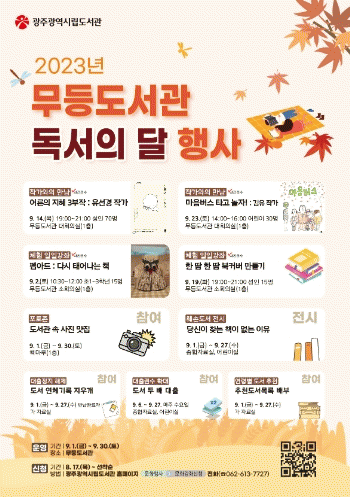 행사별 일정 확인과 참여 신청은 광주광역시립도서관 누리집에서 가능하다. 기타 자세한 내용은 무등, 사직, 산수, 디지털정보로 문의하면 된다.