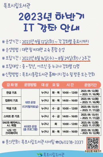 하반기 IT 강좌는 ▲한글 프로그램 기초 ▲엑셀 프로그램 기초 ▲컴퓨터 기초 ▲스마트 폰 기초(이상 대면 4개 강좌) ▲SNS와 메타버스, A.I. 체험 ▲나도 1인 크리에이터(이상 비대면 2개 강좌) 등 총 6개 강좌가 개설된다.